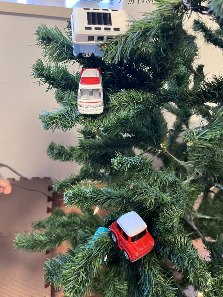 病み上がりも怠そうだったので、パパいないけど日中にクリスマスツリーを一緒に出しました。飾りつけ中に、枝にトミカが載せられていき、飾り付けが終わるとトミカはまた連れ去られ、トミカはどこでも一緒なようです。飾りつけが終わった時は、「まだやりたい!」と泣き崩れた挙句、翌日にクリスマスプレゼントが届くと勘違いも。