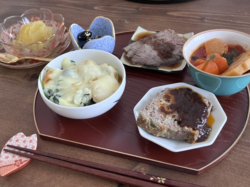 今年のおせちは、息子が食べられるように、洋風でした。えびドリア、ミートローフ、ミネストローネ(煮しめがわり)、ローストビーフ、黒豆、栗きんとん。ローストビーフも柔らかければ好きなようです。